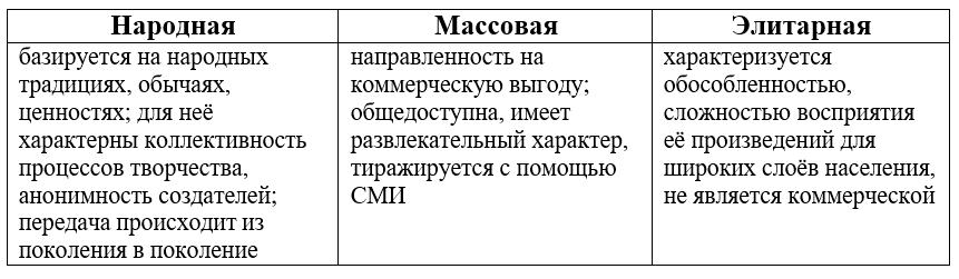 Нужно вспомнить: определение культуры, функции культуры, разновидности культуры (народная, массовая, элитарная).