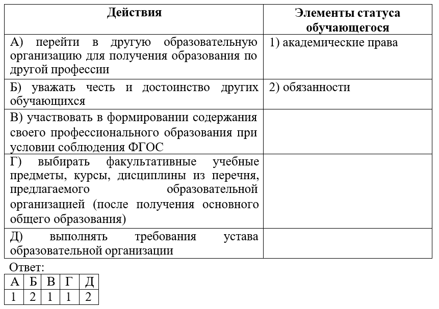 Установите соответствие между действиями и элементами статуса обучающегося в Российской Федерации: к каждому элементу, данному в первом столбце, подберите элемент из второго столбца.