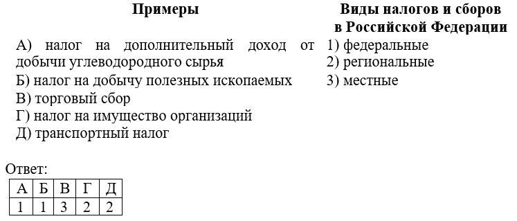 Установите соответствие между примерами и видами налогов согласно Налоговому кодексу Российской Федерации: к каждой позиции, данной в первом столбце, подберите соответствующую позицию из второго столбца.