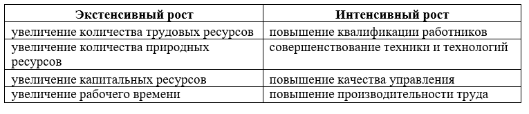 Чтобы правильно выполнить данное задание, нужно вспомнить два пути экономического роста. Интенсивный путь – повышение качества факторов производства, т. е. возможность увеличить отдачу, производительность ресурсов при том же их количестве. Экстенсивный путь – увеличение количества доступных факторов производства.
