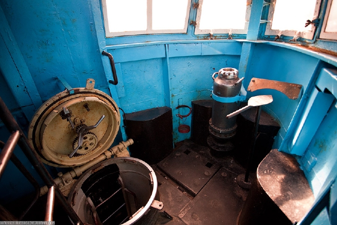 Верхний рубочный люк отсекает мостик от боевой рубки. Закрывание и открывание люка – целая наука. Нужно снять стопорный крючок, захлопнуть крышку, одновременно поворачивая кремальеру[21].