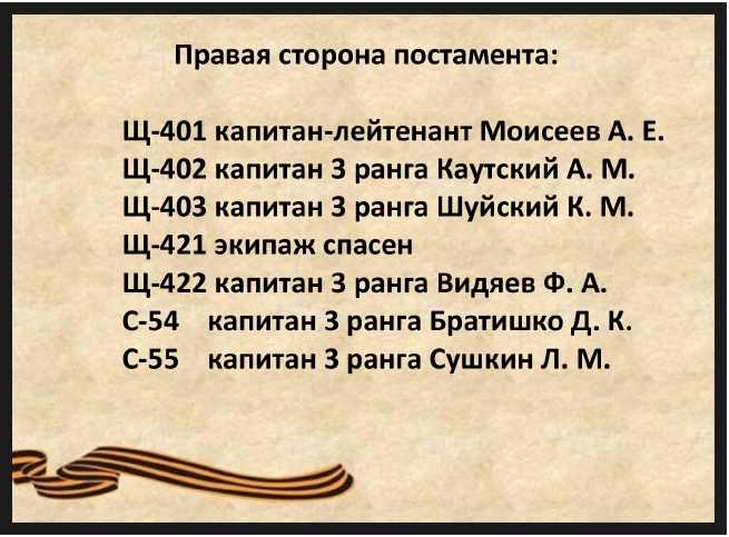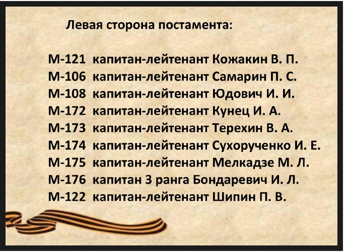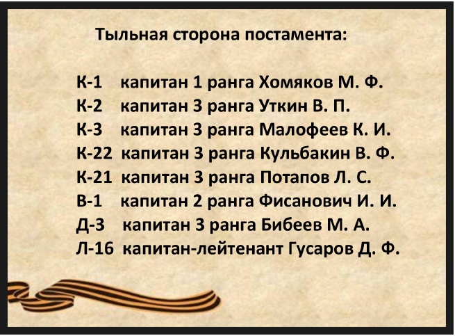 На тыльной стороне памятника слова: ОНИ ПОГИБЛИ, СРАЖАЯСЬ ЗА РОДИНУ – и ниже названия восьми подводных лодок с фамилиями их командиров: