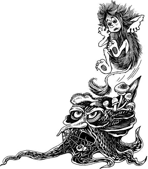 А произошло крайне неприятное событие: пенёк, на котором она только что сидела, приоткрыл правый глаз, настоящий жёлтый глаз в зелёную крапинку. Над глазами нависали древесные грибы-паразиты, возле ноздрей болталась паутина, по которой бегал испуганный паук. Видимо, паук случайно забрался пню в нос, вот тот и чихнул.