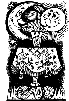 Глазам бяки открылось удивительное зрелище: перед ней, залитая лунным светом, как на ладони лежала Большая поляна – праздник Солнцестояния был в самом разгаре. По всей поляне были расставлены столы, за которыми сидели лесные существа. Многие, в основном бяки, танцевали, а сидящие за столами болтали и смеялись, и, конечно, ели: лесной народ любит вкусно поесть. Перед каждым существом стояло его любимое блюдо. Злыдни предпочитали спагетти из пиявок, фефёлы – гоголь-моголь, буки – жареных жуков с мятным соусом, а бяки – малиновый сироп. Официанты сновали туда-сюда без устали, еле успевали обслуживать посетителей. По всему лесу разносилась мелодичная волшебная музыка.