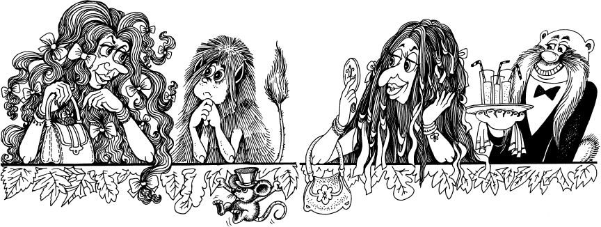 Когда музыка смолкла, вспотевшая, но очень довольная собой бяка плюхнулась за ближайший столик. Мишель, никем не замеченный, прошмыгнул вслед за ней и спрятался под кружевной скатертью из листьев. Стол был пуст – никакого угощенья, зато сидящие за столом фефёлы тут же уставились на неё любопытным, оценивающим взглядом. Выглядели фефёлы очень нарядно, а в руках они держали настоящие кожаные сумочки, как у людей. Пёстрые бантики украшали фефёл с головы до ног – висели на челке, обвивали запястья и лодыжки, торчали из тоненьких косичек на спине.
