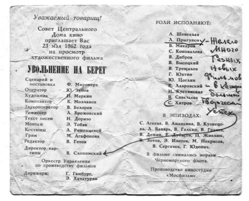 «Мой муж Борис Клементьевич в 1961 году служил завскладом на Водной станции КЧФ и обеспечивал военными реквизитами всех артистов, живших и работавших на крейсере “Михаил Кутузов”. Как-то к нему с необычной просьбой обратился второй режиссёр картины “Увольнение на берег” Левон Кочарян. Он посетовал, что уже двадцать дней живут они в Севастополе, а ни разу знаменитой черноморской ставридки так и не попробовали.