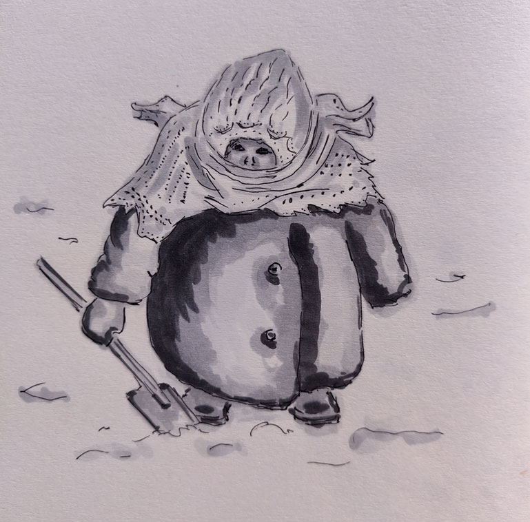 Однажды мама, проходя мимо яслей, увидела, как на прогулку вывели таких колобков. На улице было морозно и скользко. Колобки в хаотичном порядке попадали на снег, воспитательница бросилась их поднимать…