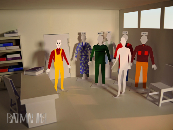Авистэй вошёл в комнату, где всё было уставлено плоскими бумажными манекенами в различной одежде. Он даже сначала принял их за настоящих, живых ватманцев, но, увидев, что у них нет лиц и вместо ног плоские большие подставки, немного расстроился. Вскоре откуда-то из глубины комнаты вынырнул человечек в жёлтом комбинезоне и красной рубахе.