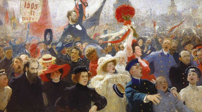 Визуально эти настроения гениально показаны на картине И.Е. Репина. Художник изобразил на этом полотне восторженную толпу, что устремляется куда-то вперёд, неся на плечах освобождённого из узилища революционера, а пьяные от счастья гимназисты и студенты, барышни и семинаристы с наслаждением бросают в лицо режиму что-то задорно-мятежное – то ли «Марсельезу», то ли «Варшавянку». И все яростно отрекаются от старого мира.