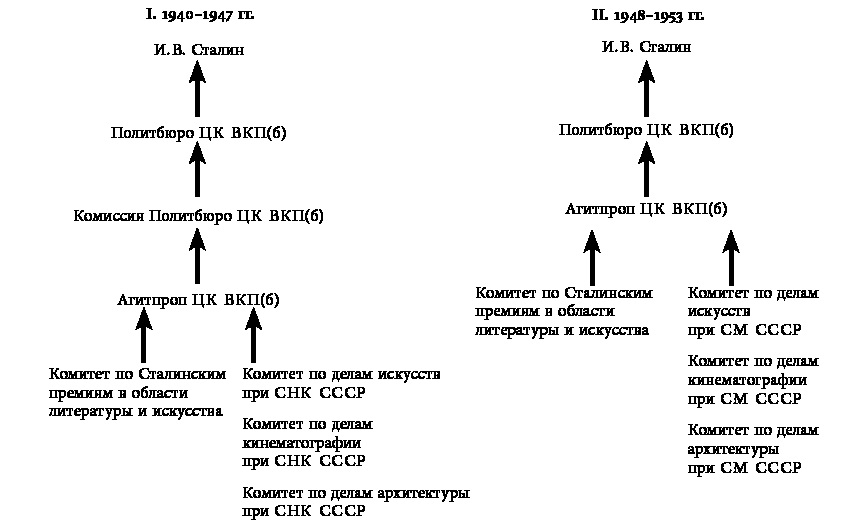 Стоит отметить, что на каждом из этих этапов список предложенных Комитетом кандидатур корректировался, а в Комиссию Политбюро (этот орган был создан постановлением Совнаркома № 1202 от 28 мая 1945 года не в качестве постоянно действующей институции, а формируемой ежегодно) поступало несколько «редакций» этого списка, содержавших правки, внесенные по результатам обсуждений в каждой из организаций. И уже Комиссией Политбюро формировался итоговый список кандидатов, по возможности учитывавший все ранее поступившие предложения; именно он обсуждался на заседаниях Политбюро. С усилением позиции Жданова в 1947–1948 годах необходимость в ежегодном созыве Комиссии Политбюро исчезла108, а ее полномочия перешли к Агитпропу. Очевидно, что последнее слово в решении вопроса о присуждении произведению Сталинской премии оставалось за человеком, чье имя носила награда. Вся эта система строго укладывается в схему, отражающую ее устройство в довоенный и послевоенный периоды109.