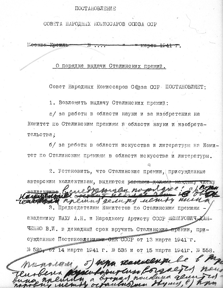 Ил. 2–3. Проект постановления СНК СССР «О порядке выдачи Сталинских премий», 25 марта 1941 г. // РГАНИ. Ф. 3. Оп. 53а. Ед. хр. 1. Л. 30–30 об.