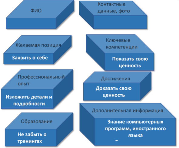 Информацию в резюме следует излагать в нескольких основных структурных блоках. Мы предлагаем подумать о следующих блоках: