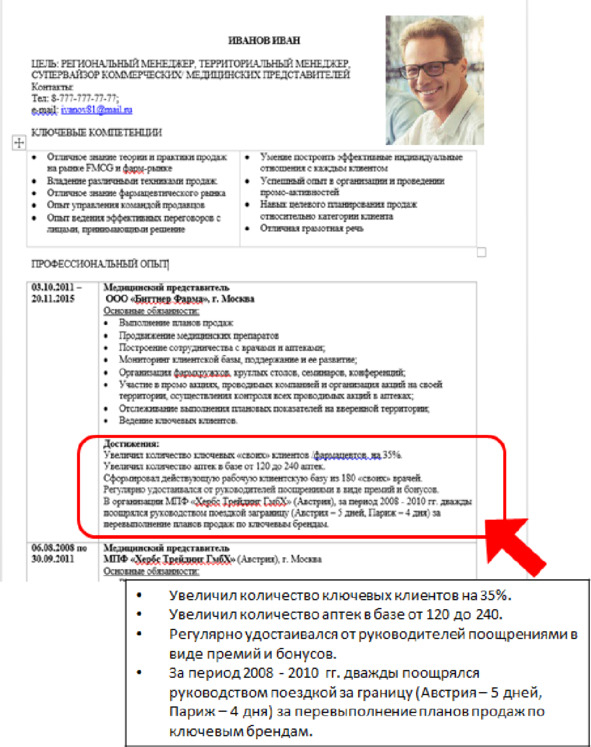 Информация об умениях и достижениях может оказаться распределенной по всему тексту резюме, по мере перечисления ответственности и должностей.