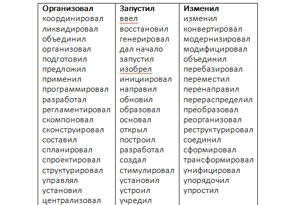 В примерах достижений используются активные слова в прошедшем времени, что помогает подчеркнуть проявленные умения и конкретный достигнутый результат. Внизу приведен список активных слов-синонимов, который может Вам пригодиться: