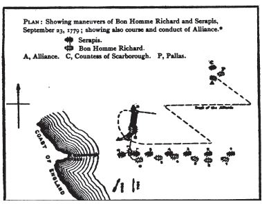 Plan: Showing maneuvers of Bon Homme Richard and Serapis, September 23, 1779; showing also course and conduct of Alliance. After a drawing by Captain A. T. Mahan, U. S. N., by permission of Charles Scribner's Sons.