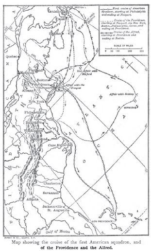 The suggested enterprise found favor in the mind of Commodore Hopkins, who forthwith assigned Jones to the command of a squadron comprising the Alfred, the Providence, and the brigantine Hampden. Jones hoisted his flag on board the Alfred and hastened his preparations for departure. He found the greatest difficulty in manning his little squadron, and finally, in despair of getting a sufficient crew to man them all, he determined to set sail with the Alfred and the Hampden only, the latter vessel being commanded by Captain Hoysted Hacker. He received his orders on the 22d of October, and on the 27th the two vessels got under way from Providence. The wind was blowing fresh at the time, and Hacker, who seems to have been an indifferent sailor, ran the Hampden on a ledge of rock, where she was so badly wrecked as to be unseaworthy. Jones put back to his anchorage, and, having transferred the crew of the Hampden to the Providence, set sail on the 2d of November.