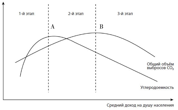 Рис. 2. Три основных этапа интенсивности выбросов CO2 и общего объёма выбросов CO2