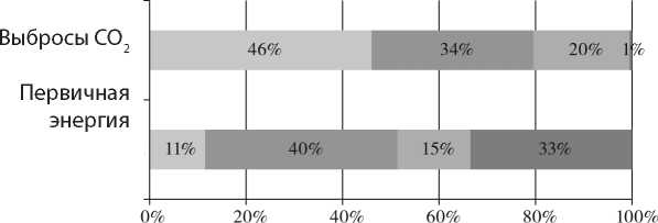 Рассматривая ситуацию с точки зрения использования первичной энергии, можно сказать, что хотя доля потребления нефти чрезвычайно высока (около 40% от всей используемой первичной энергии), выбросы углекислого газа от сжигания угля составляют наибольшую долю – около 46% (см. рис. 5).