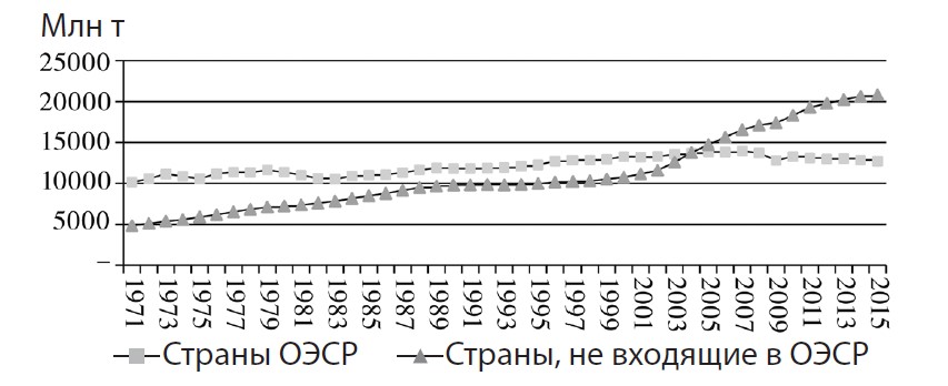 В условиях глобального экономического и социального развития спрос на энергию быстро растёт. В 2015 году уровень мирового потребления первичной энергии (ОППЭ) увеличился примерно в 1,6 раза по сравнению с 1971 годом, и это в основном касалось потребления ископаемых видов топлива. С увеличением потребления энергии глобальные выбросы двуокиси углерода (CO2) демонстрируют чёткую тенденцию к росту. В 2015 году общие глобальные выбросы углерода составили 33 508 млн. тонн, что на 0,11% больше, чем в 2012 году; среди них в странах, состоящих в Организации экономического сотрудничества и развития (ОЭСР), с 2008 года выбросы углекислого газа на региональном уровне сокращались; и, напротив, с 2000 года выбросы углерода в странах, не входящих в ОЭСР, быстро росли (в среднем на 69 477 млн. тонн в год), а среднегодовые темпы роста составили около 5,07% (см. рис. 3).