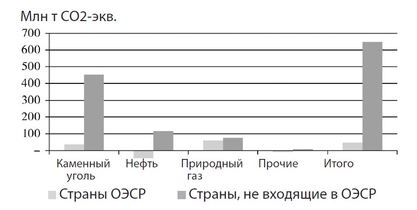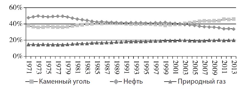 С 1980-х по 2000 год выбросы углекислого газа от потребления угля и нефти оставались неизменными и составляли около 40%. В странах ОЭСР наибольшие выбросы углерода были связаны с использованием нефти, тогда как для стран, не входящих в ОЭСР, основным энергетическим продуктом, который приводил к значительному увеличению выбросов CO2, является уголь. С 2002 года ситуация с источниками выбросов углекислого газа в мире значительно изменилась: выбросы от использования угля превысили выбросы от нефти, которые стабильно сокращались. В 2013 году выбросы углерода от угля увеличились на 3,41% до 14 809 млн. тонн (см. рис. 6).