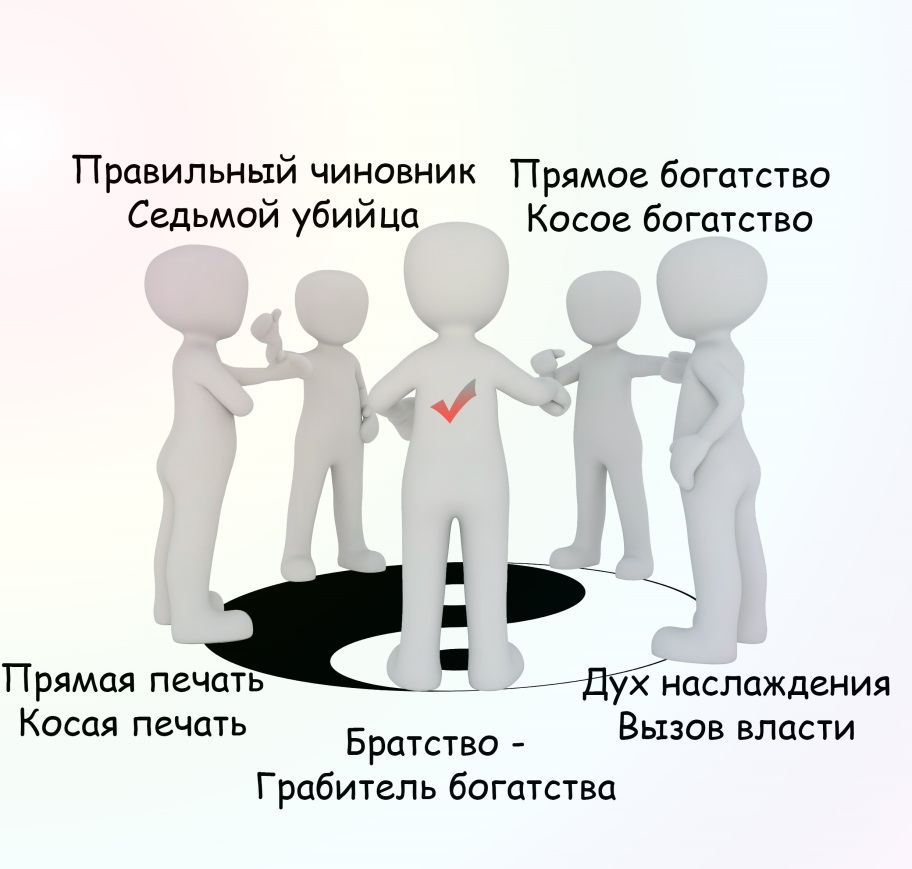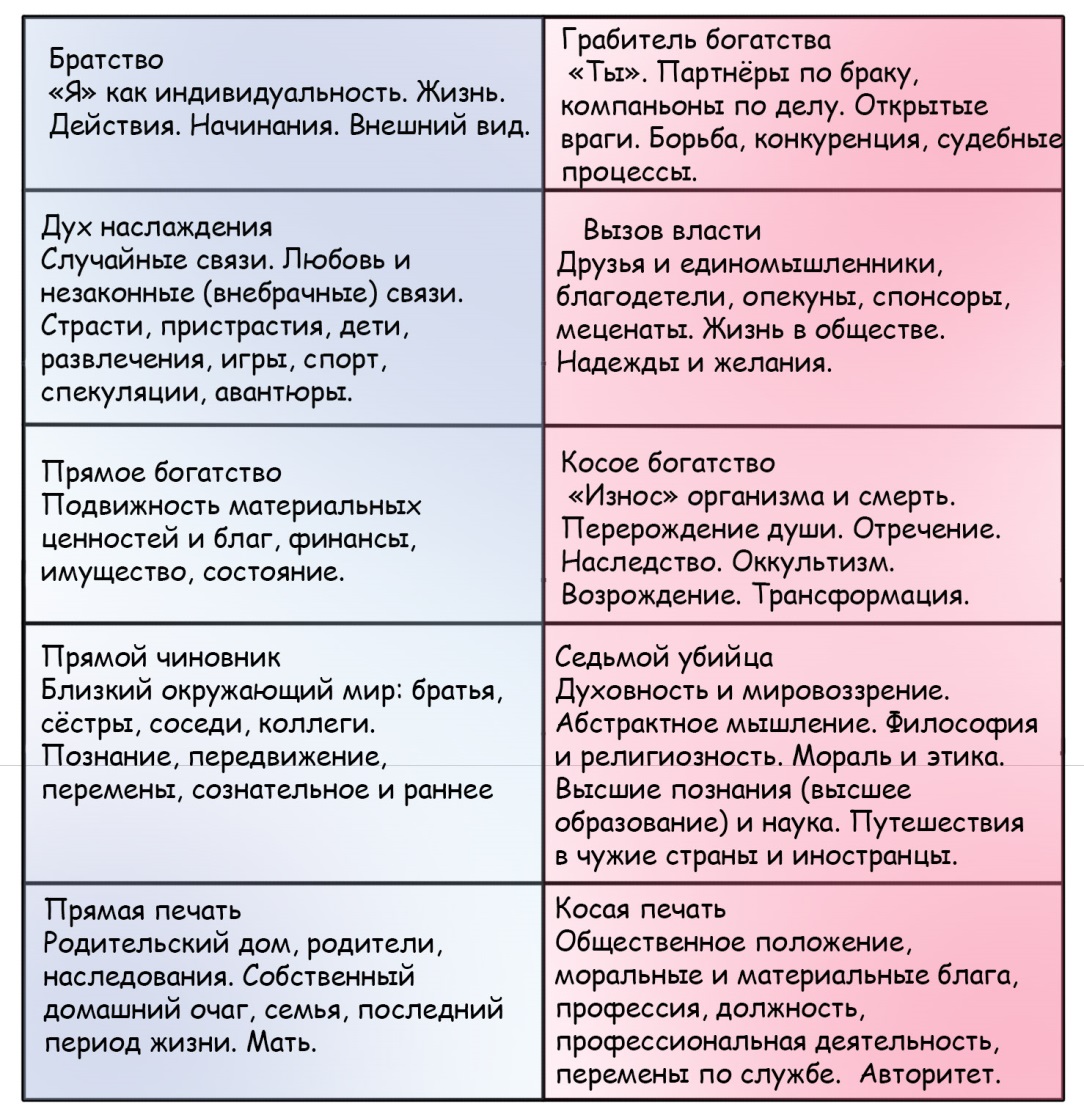 Расширенное описание: друзья, единомышленники, соучастники, опекуны, спонсоры, меценаты, покровители, в том числе из высших эшелонов власти. Защитники, советники, фавориты. Опять же данная интерпретации, на мой взгляд, более верная, чем простое объяснение, дескать, Вызов власти – это невостребованный талант и отвратительное высокомерное поведение. Отчасти так оно и есть, но также стоит заметить, что Вызов власти присутствует у очень многих талантливых политиков и руководителей современных бизнесов, изобретателей, успешных бизнес-стартаперов. Наглое и напористое поведение, огромная убежденность в собственной правоте не свойственна традиционному Духу наслаждения, и потому, при хорошем контроле, Вызов власти дает много бонусов и преимуществ в жизни.