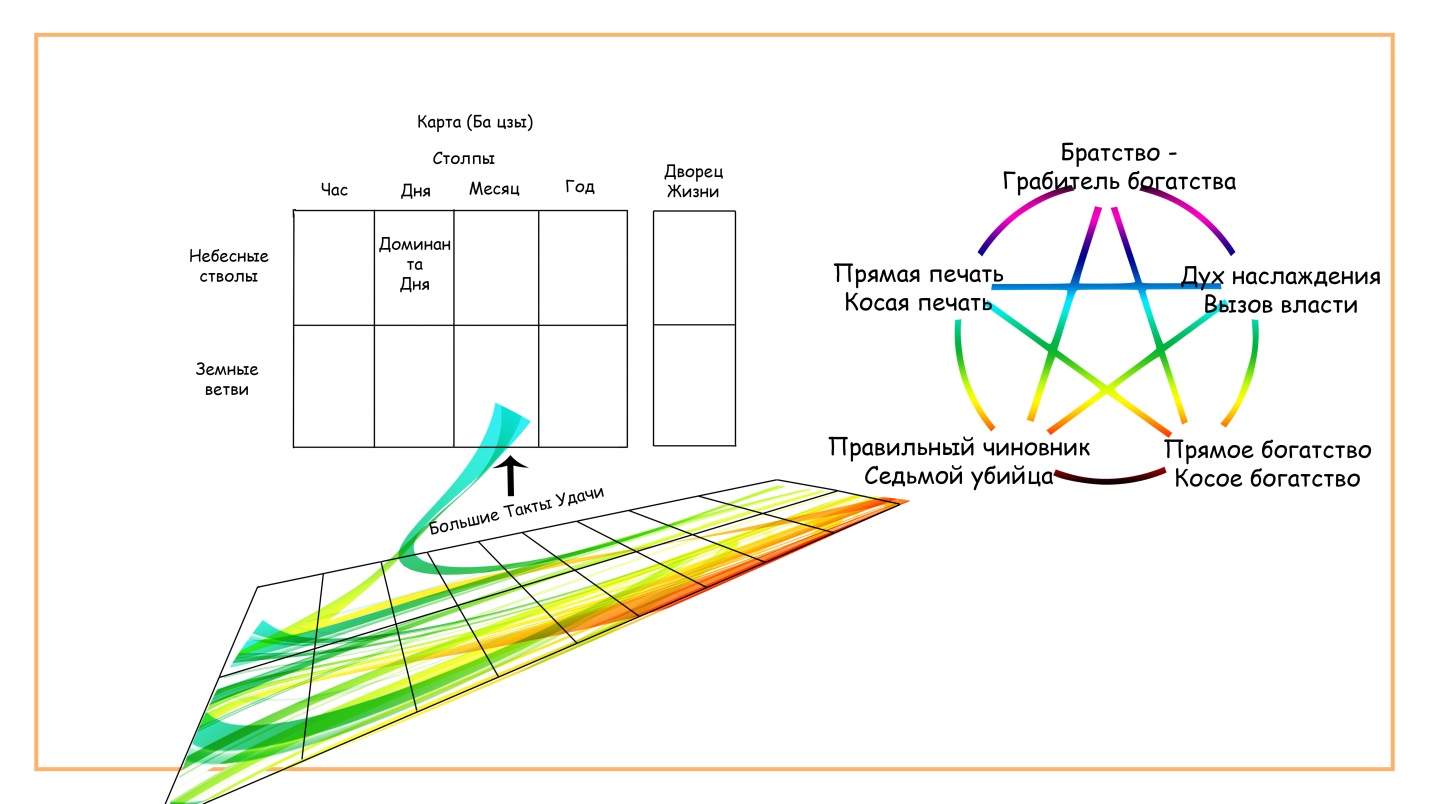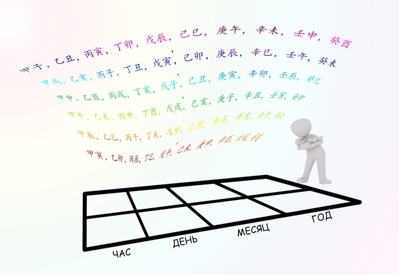 Китайский гороскоп состоит из трех составляющих: карта (дата рождения личности и его час рождения), такты удачи и индивидуальный круг У-Син с 10 божествами относительно личной небесной стихии человека (Доминанта дня, господин дня или НС дня).