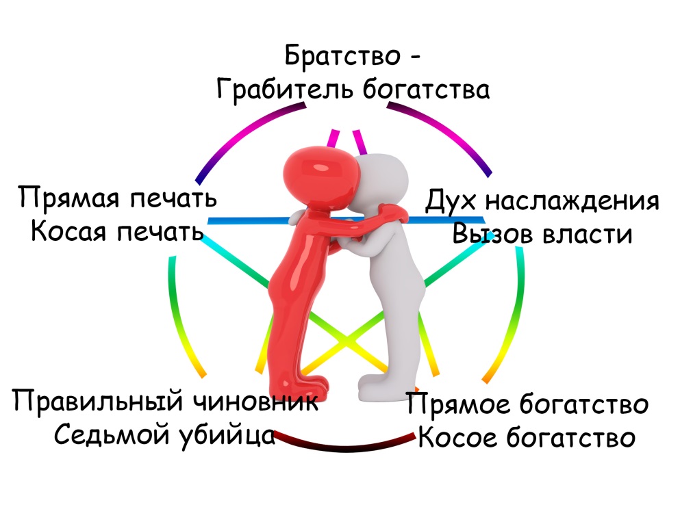 Очень часто партнера по браку смотрят через приход Правильного чиновника или Богатства в карту, но на самом деле и то и другое не совсем корректно, тем более в современных условиях. Связано это с принципом объединения в одно целое, как две половинки целого, подобно этому муж и жена соответствуют символу равновесия и являются целым. Образ Грабителя богатства – это в первую очередь образ партнерства, благополучного или нет, это уже другой вопрос. Поэтому при заключении брака в гороскопе и в самом деле должны присутствовать Правильный чиновник или Богатство, но люди заключают союзы, как правило, с себе подобными, равными, из одной стихии, либо на слиянии со своей родной стихией.