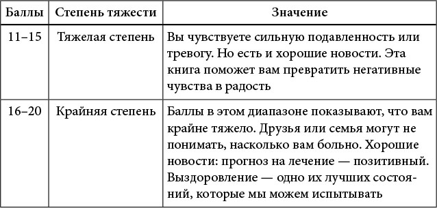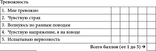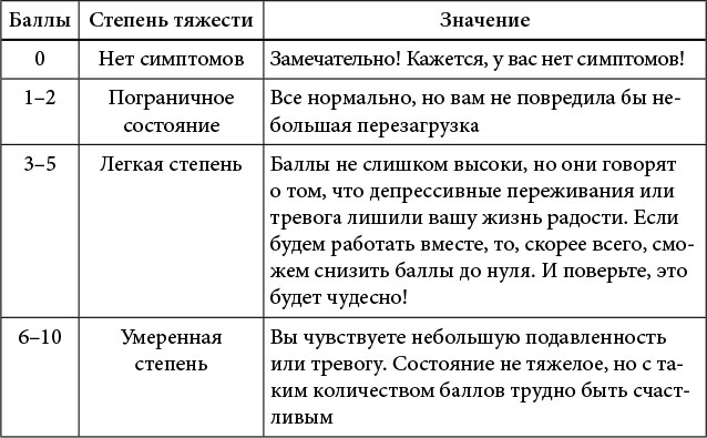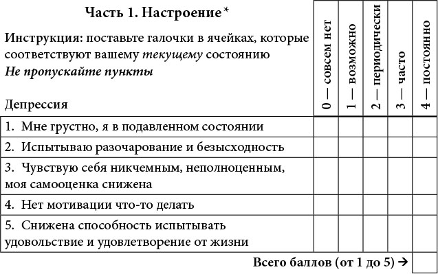 Эта книга помогает менять самочувствие, поэтому сначала давайте определим, как вы чувствуете себя сейчас. Отметьте подходящие пункты, затем подсчитайте и запишите общее количество баллов для каждого состояния – депрессивного и тревожного – в соответствующих ячейках. Это же задание я попрошу вас пройти ближе к концу книги. Так, сравнив баллы, вы сможете увидеть, насколько изменилось ваше состояние.
