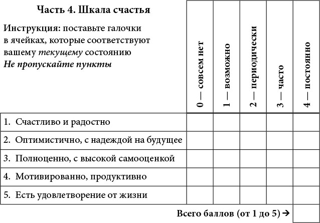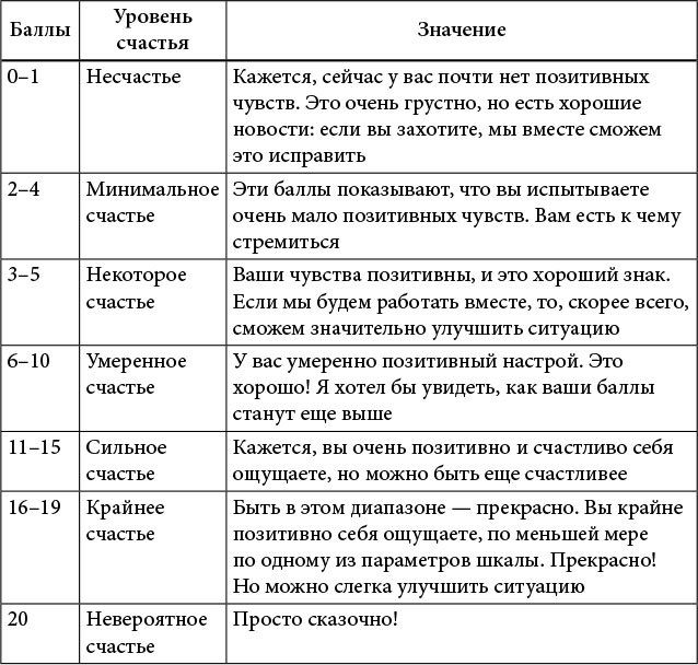 В конце книги мы еще раз пройдемся по шкале счастья, чтобы узнать, насколько сильно повысилось ваше ощущение счастья. И на всякий случай напоминаю, что эту шкалу, как и все остальные, можно заполнять так часто, как вы захотите, чтобы отслеживать со временем перемены в ощущениях.