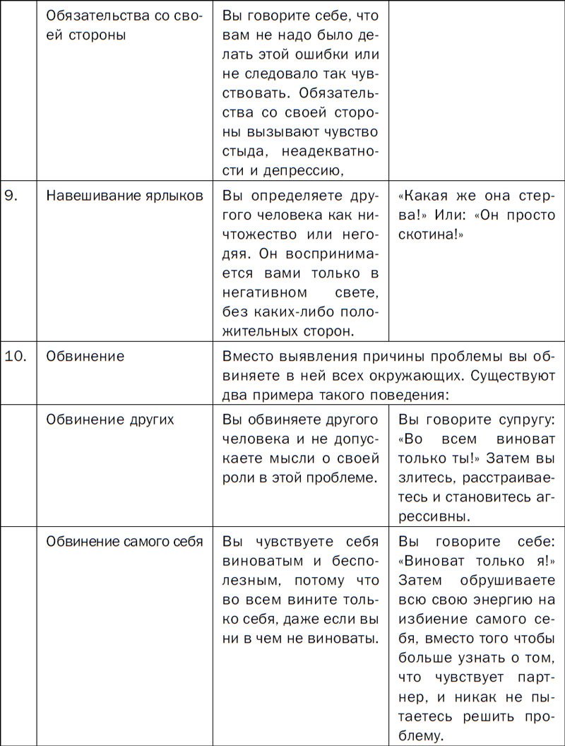 Коллега направил ко мне для лечения от депрессии 45-летнего бизнесмена из Сан-Франциско. Микки прошел курс антидепрессантов, но ни одно средство так и не смогло поднять его настроение. Я отменил все прежние препараты Микки, поскольку толку от них явно не было. Вместо этого я применил когнитивную терапию, и в течение нескольких недель его депрессия прошла. Мне показалось, что лечение помогло, так как он производил впечатление человека, избавившегося от всех симптомов депрессии. К моему удивлению, Микки попросил разрешения посещать мои занятия «с целью роста». Он объяснил, что недоволен своим браком и у него есть длинный список недостатков жены Марджи. Он сказал, что потерял к ней всякое уважение, потому что: