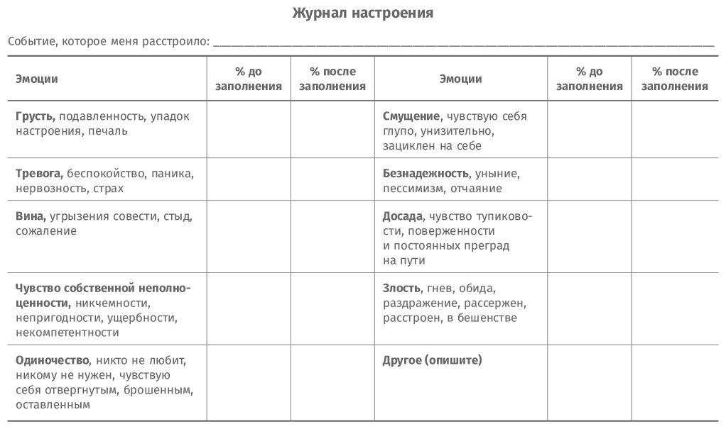 В ее улучшении сыграли роль несколько ключевых факторов. Во-первых, Марша сосредоточилась на конкретном моменте, когда почувствовала тревогу. Во-вторых, она точно определила, что чувствовала, и записала негативные эмоции, которые были причиной ее беспокойства, вины и стыда, в журнале настроения. Это позволило нам обоим увидеть, что именно она говорила себе. Но все мы разные и размышляем по-разному. Одно из важнейших достоинств журнала настроения в том, что он отражает ваши собственные уникальные мысли и чувства.
