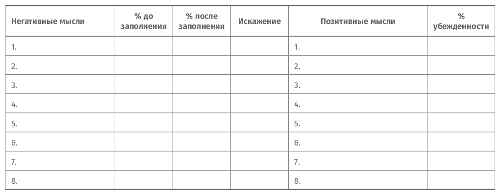 Шаг 5. Позитивные мысли. Ответьте на каждую негативную мысль новым утверждением, которое будет более позитивным и реалистичным. Определите, насколько вы верите каждой позитивной мысли по шкале от 0 (совсем нет) до 100 % (абсолютно убежден). Запишите эти оценки в графе «% убежденности». Теперь снова оцените вашу убежденность в негативные мысли и запишите новую оценку в графе «% после заполнения».