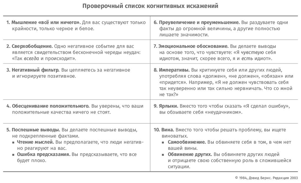 Что вы получаете от определения искажений в своих негативных мыслях? Во-первых, вы увидите, что негативные мысли даже близко не столь реалистичны, как вы думали. Вы помните, что Марша верила в большинство своих негативных мыслей на 100 %. Но насколько реалистичной может быть мысль, если она содержит столько искажений? И кроме того, искажения дают вам некое руководство, как подвергнуть негативную мысль сомнению. Я покажу вам, как можно использовать множество техник, которые помогут вам избавиться от чувств тревоги, паники и депрессии. Так что, после того как вы определите искажения в мыслях, вы также сможете выбирать, какие техники следует применить первыми.