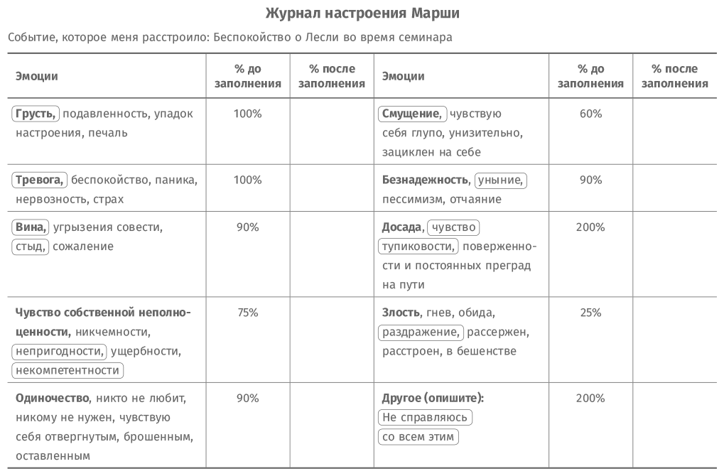 Чтобы выяснить, почувствовала ли она себя лучше, я попросил Маршу снова оценить степень негативных эмоций по шкале от 0 (совсем нет) до 100 % (крайне сильно). Как вы видите в колонке «% после заполнения», в разделе «Эмоции», все негативные чувства значительно ослабли. Она все еще чувствовала некоторую грусть с примесью тревоги и вины, и это было абсолютно нормально. В конце концов, она только что вспоминала о смерти своей дочери.