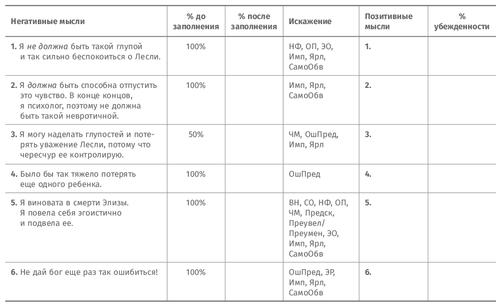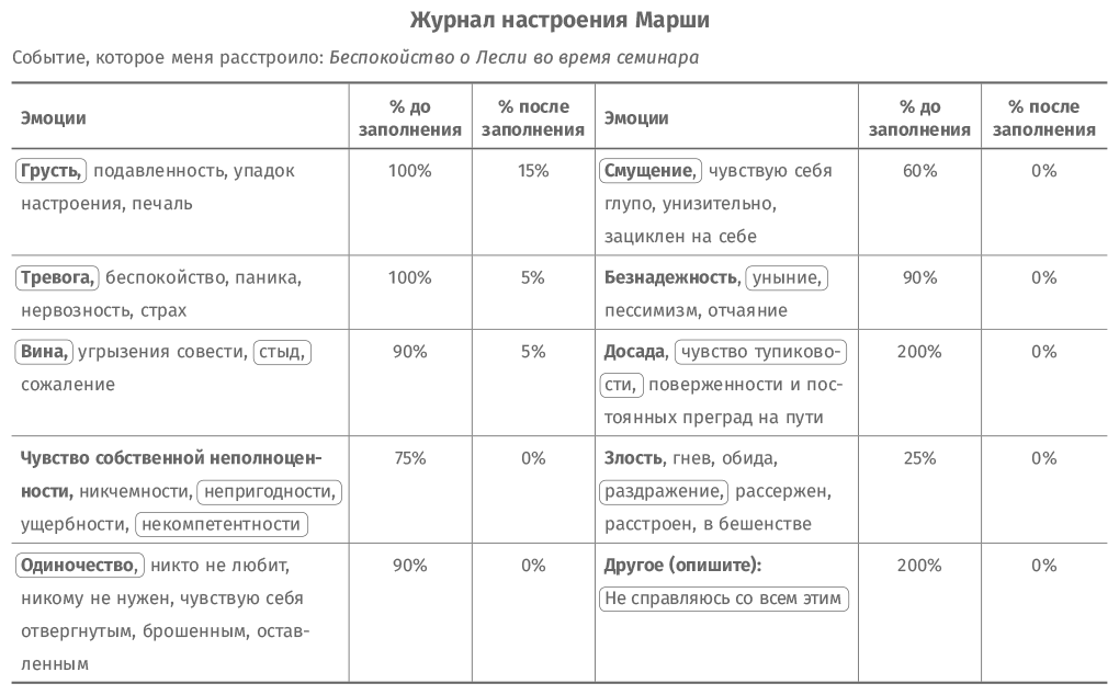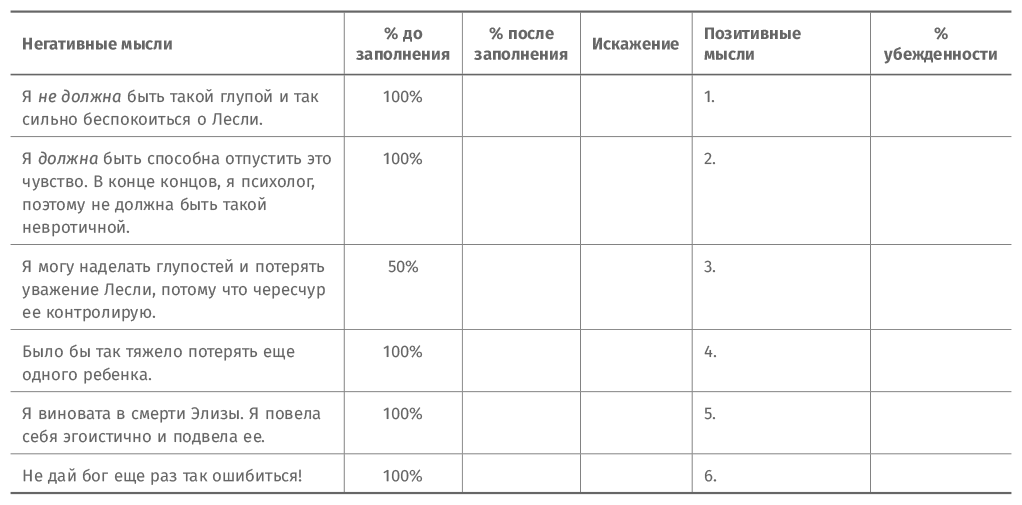 Как вы видите выше, оценки в графах «% до заполнения» показывают, что Марша верила на 100 % в первые две негативные мысли и на 50 % – в третью мысль. То есть у Марши были две проблемы: беспокойство и неконтролируемая самокритика из-за ее беспокойства.