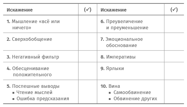 Шаг 4. Искажения. Определите искажения для каждой негативной мысли, используя проверочный список когнитивных искажений в нижней части второй страницы журнала настроения.