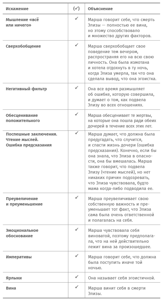 Я спросил, над какой мыслью Марша хотела бы поработать в первую очередь. Она выбрала пятую мысль: «Я виновата в смерти Элизы. Я повела себя эгоистично и подвела ее». В следующей таблице отметьте галочками, какие искажения присутствуют в этой мысли. Определения когнитивных искажений, приведенные ранее, помогут при выполнении этого упражнения. Определять искажения в негативных мыслях – это скорее искусство, чем наука. Так что вам не стоит беспокоиться о том, чтобы полностью все сделать правильно.