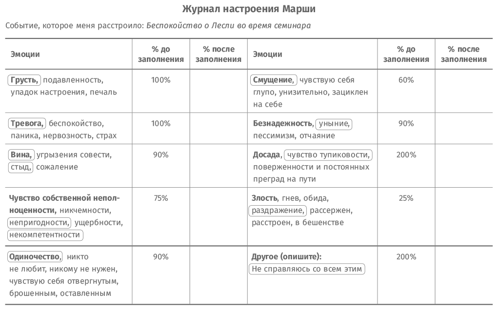 Журнал настроения Марши приведен ниже. Как видите, в качестве расстраивающего события она просто указала беспокойство о Лесли во время семинара. Я попросил Маршу определить и оценить ее негативные чувства. Журнал настроения содержит 10 категорий эмоций. Первая категория – это «грусть, подавленность, упадок настроения, печаль». Марша обвела слово «грустный» и оценила это чувство на 100 % в графе «% до заполнения», потому что испытывала глубочайшую грусть. Она также обвела в кружок чувства тревоги, вины, стыда, непригодности, некомпетентности, одиночества, смущения, уныния, тупиковости, раздражения и неспособности справиться со всем этим. Самыми сильными чувствами были «в тупике» и «неспособность справиться», которые она оценила на 200 %. Эти негативные чувства зашкаливали!