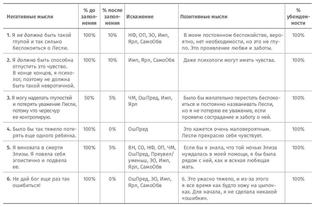 Позитивная мысль Марши была абсолютно правдоподобной. Она также подвергла сомнению негативную мысль и больше не считала, что Элиза умерла из-за ее эгоизма. Это означает, что позитивная мысль оказалась достаточно сильной, чтобы соответствовать необходимому и достаточному условиям для эмоциональных изменений. И действительно, Марша испытала внезапную волну облегчения, больше не чувствовала себя виноватой и не стыдилась сама себя из-за смерти дочери. Я спросил, не приходило ли ей в голову, что вина, которую она чувствовала по поводу смерти Элизы, и постоянное беспокойство о Лесли были как-то связаны. Иными словами, возможно, что она постоянно волновалась о Лесли, чтобы убедиться в том, что снова не потеряет дочь?