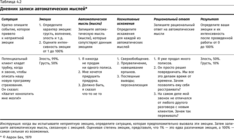 Доктор Аарон Бек разработал чуть более подробную форму под названием «Дневник записи автоматических мыслей», который позволяет записывать не только расстраивающие мысли, но и чувства, и само негативное событие, которое их запустило (см. табл. 4.2).