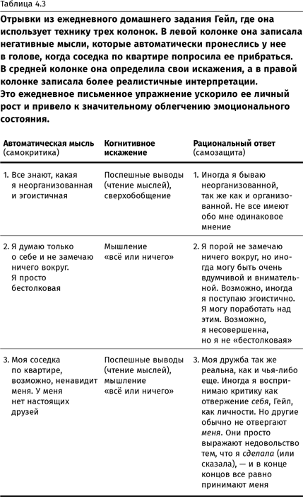 Ниже описан опыт Гейл, секретаря, чья самооценка была настолько низкой, что девушка постоянно боялась критики со стороны друзей. На нее настолько сильно подействовала просьба соседки по квартире помочь прибраться после вечеринки, что она ощутила себя отвергнутой и никчемной. Изначально Гейл была настолько пессимистично настроена в отношении улучшения состояния, что я едва смог уговорить ее попробовать применить технику трех колонок. Когда девушка с неохотой решила все-таки попробовать, то удивилась, насколько быстро начали меняться ее самооценка и настроение. Она рассказала, что именно запись мыслей, которые проносились у нее в уме в течение дня, позволила оценить их объективно. Гейл перестала воспринимать эти критические мысли всерьез. В результате такой ежедневной практики записи мыслей она почувствовала себя лучше, а в ее межличностных отношениях произошел настоящий квантовый скачок. Отрывок из ее домашнего задания приведен в таблице 4.3.