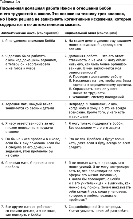 Затем мы работали над ответами на «автоматические мысли», которые она записала после звонка учительницы Бобби (см. табл. 4.4). По мере того как Нэнси научилась давать отпор самокритичным мыслям, она испытала долгожданное и такое необходимое эмоциональное облегчение. После этого она выработала несколько стратегий, чтобы помочь Бобби справиться с трудностями.