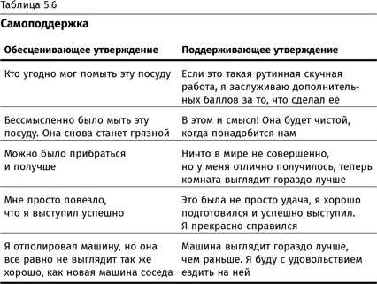 Достойный первый шаг к тому, чтобы повернуть вспять эту деструктивную тенденцию, – отследить обесценивающие мысли и заменить их более объективными и поддерживающими. Несколько примеров приведены в таблице 5.6. Когда вы натренируетесь, осознанно оказывайте себе поддержку в течение дня даже в мелочах. Поначалу вы можете не почувствовать никакого эмоционального подъема, но продолжайте практиковаться, даже если вам это кажется механистичным. Через несколько дней вы почувствуете, как настроение улучшается, и вы будете больше гордиться тем, что вы делаете.
