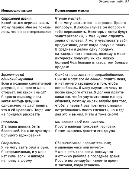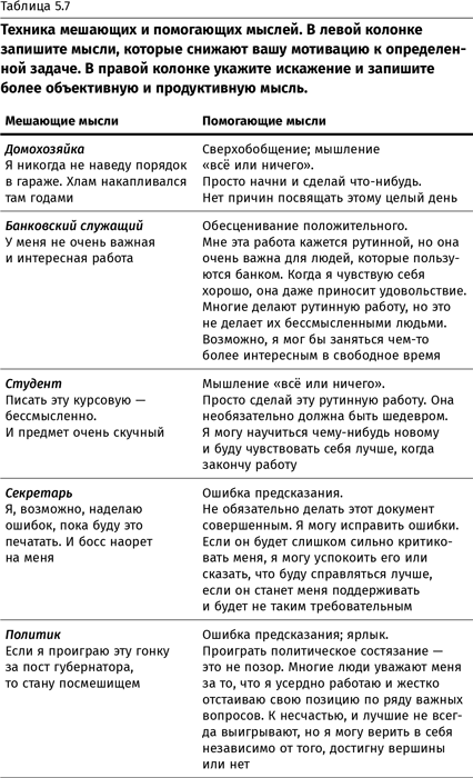Техника мешающих и помогающих мыслейЕсли вы прокрастинируете, пытаясь взяться за какую-то конкретную задачу, обратите внимание на то, как вы о ней думаете. Мешающие мысли потеряют свою силу, если вы их просто запишете и замените на помогающие, используя две соответствующие колонки. В таблице 5.7 приведены несколько примеров, как это делать. Когда вы запишете мешающие и помогающие мысли, убедитесь, что установили искажение в мешающей мысли, которое вас тормозит. Например, вы можете обнаружить, что ваш худший враг – это мышление «всё или ничего», или обесценивание положительного, или у вас есть вредная привычка давать необоснованные прогнозы. Поняв, какой вид искажения наиболее часто препятствует вашим планам, вы сможете исправить это. Прокрастинация и напрасная трата времени уступит действию и креативности.