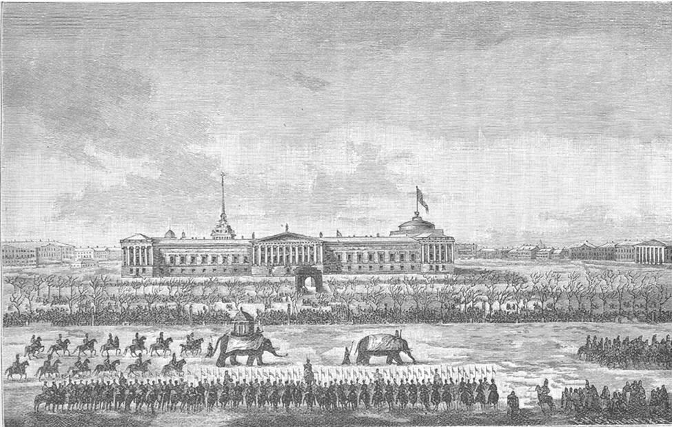 Рис. 3. Процессия со слонами, подаренными русскому царю персидским шахом. Гравюра с акварели Воробьева [Пыляев 1990б: 44]