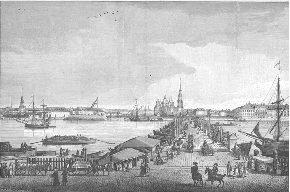 Рис. 2. Вид на Исаакиевский мост и на город от Адмиралтейства до Сенатской площади. Гравюра с рисунка Патерсена (1794) [Пыляев 1990б: 42]