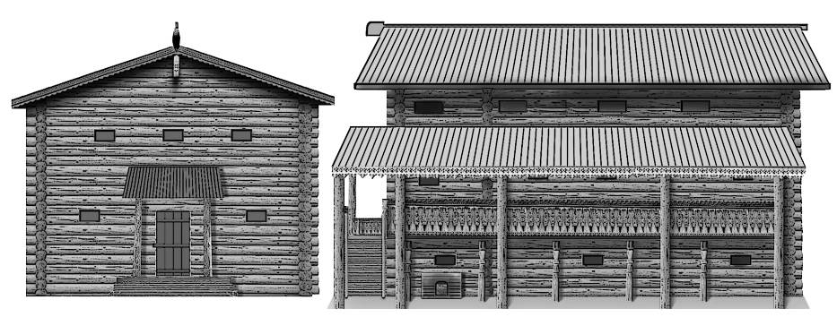 Первый этаж большого терема был наполовину заглублён в грунт, и лестница вела сразу ко второму уровню строения – к пристроенной по двум сторонам галерее с ажурным ограждением и крышей, край которой тоже украшала причудливая резьба. Основание галереи снизу поддерживалось толстыми балясинами, а её крыша опиралась на крепкие бревенчатые столбы. С правого бока к терему почти вплотную примыкало строение поменьше и пониже, а слева находилась клетушка, походившая на летнюю кухню. От терема её отделяла небольшая возвышенность с двускатной крышей, слегка присыпанная землёй, – скорее всего, это был погреб.