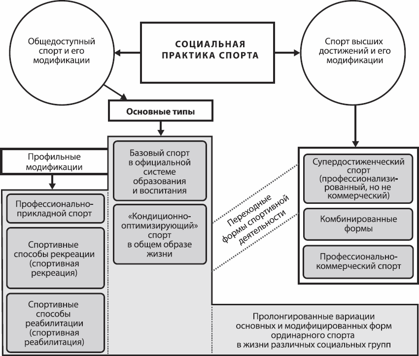 В ходе исторического развития спорт постепенно приобрел черты социального института, удовлетворяющего общественно значимые потребности, связанные прежде всего с выполнением стандартизированных социальных функций гармоничного духовного и физического воспитания и развития личности, выявления и сравнения способностей человека в борьбе за наивысшие достижения, а также реализующего функции зрелищного мероприятия. Дифференцировались его связи с другими социальными институтами и социальной системой в целом. Спорт стал полифункциональным. При этом необходимость и возможность удовлетворения потребностей в разных сферах жизни общества позволили сформировать модификации его практики применительно к особенностям той или иной общественной группы.