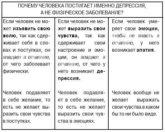 При депрессии человек подавлен, угнетён, удручён, скован, ущемлён. Кто постоянно ощущает, будто на него давит пресс, тот отчаянно пытается найти способ избавиться от прессинга, отсюда и название этого состояния – депрессия. Чтобы вылечить депрессию, надо снять заслонку и дать выход подавляемым эмоциям. Надо бы, а как поступают в жизни? Поступают как раз наоборот.