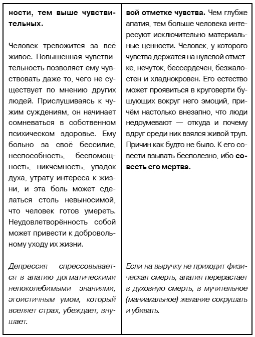 Мы знаем: упорство и труд всё перетрут. Чем твёрже мы знаем и верим в то, что весёлое и хорошее настроение, физическая деятельность, качественная пища, материальное благополучие, всевозможные изобретения во имя здоровья и счастья человека, включая химию, позволяют человеку быть здоровым и счастливым либо стать таковым, тем глубже оказывается подстерегающая нас депрессия. Когда нам приходится признать, что преодоление земных круч не помогает преодолеть духовные кручи, тогда-то мы и оказываемся в трясине разочарований, а иначе говоря, в депрессии.